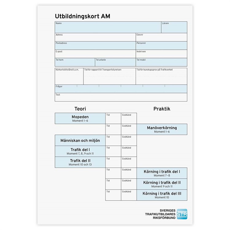 Kortet utgår från teori- och körmomenten i AM-utbildningen.Fakta: De levereras i buntar om 50 st.